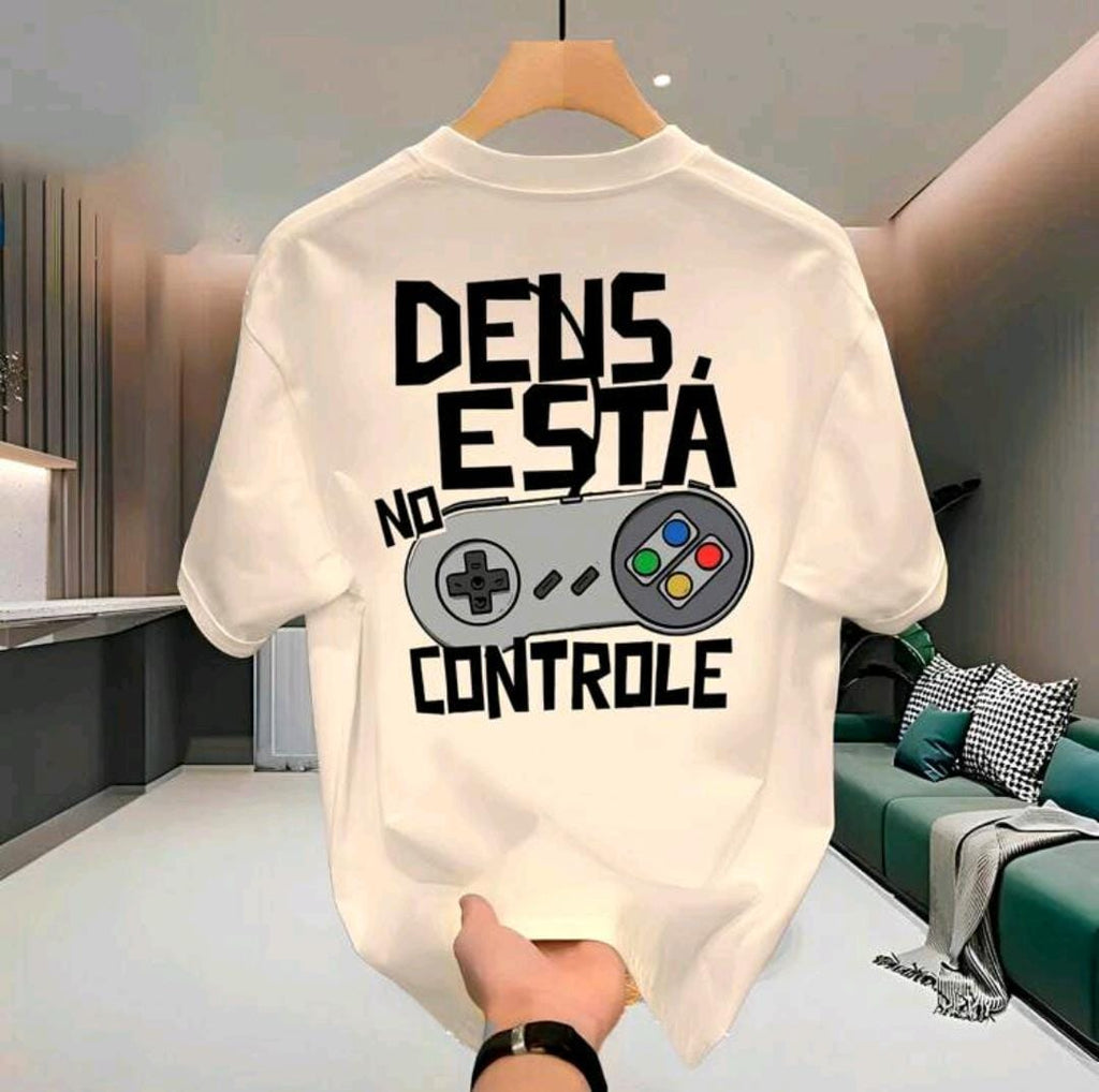 🎮 Estampa exclusiva com controle gamer e a frase “Deus Está no Controle”